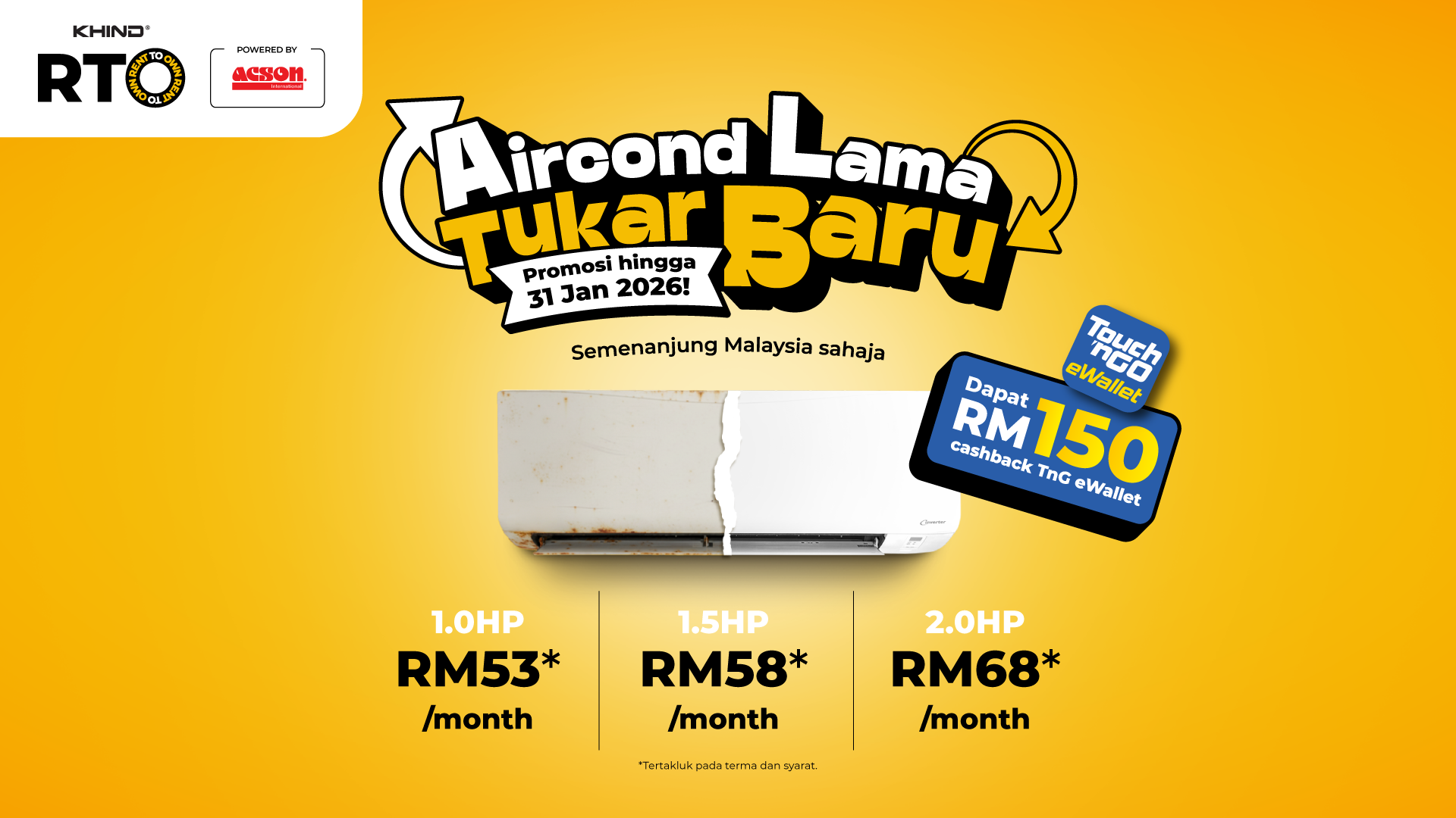 Dengan promosi Trade-In KHIND RTO, anda boleh tukar aircond lama ke KOOL Series KHIND RTO dan terus dapat RM150 Touch ‘n Go eWallet. Lagi best, semuanya boleh dibuat secara sewa beli (rent to own). Lebih fleksibel, lebih mampu milik, dan sesuai untuk semua rakyat Malaysia.